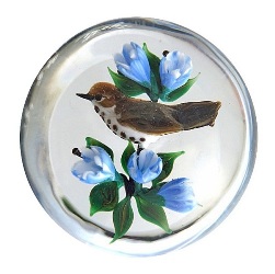 Drossel mit blauem Flax, klarer Grund, nur Einzelstücke, signiert, ’87 Miniatur-Paperweight M-5, D: ca. 5,3 cm