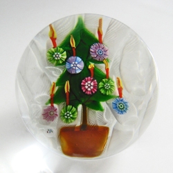Mit Kerzen und bunten Kugeln geschmücktes Weihnachtsbäumchen auf weißem Lace-Grund; 1979, ’J’-Signatur-Cane, lim. Ed. 101 Miniatur-Paperweight, D: ca. 5,6 cm