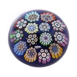 Bunte, komplexe Millefiori-Canes auf blauem Grund; ’PMcD’-Signatur-Cane, Miniatur-Paperweight, D: ca. 4,9 cm Hersteller: Peter McDougall - PMcD Glass Studio, Schottland