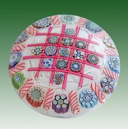Buntes Millefiori im Schachbrettmuster auf weißem Lace, 2007, ’PMcD’-Signatur-Cane, D: ca. 7,6cm verkauft/sold Peter McDougall