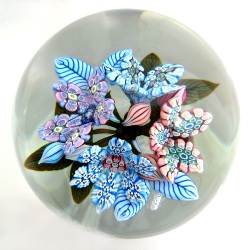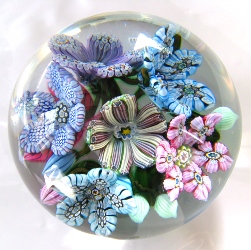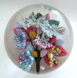 Wie ein orientalisches Märchen aus Tausendundeiner Nacht: Dreidimensionales Millefiori-Blumenbukett in zarten Pastellfarben auf klarem Grund. Keine der vier Blüten gleicht der anderen; zusätzlich verschiedenfarbige Knospen und grüne Blätter. Noch niemals zuvor ist Millefiori so verarbeitet und gezeigt worden - eine ureigene Idee von Peter McDougall. ’PMcD’-Signatur-Cane, Unikat, 2008, D: ca. 7,7 cm