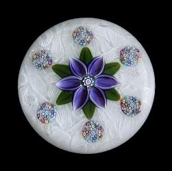Lila Blüte mit grünen Blättern auf weißem Latticinio, umgeben von sechs komplexen Millefiori-Canes; ’PMcD’-Signatur-Cane, D: ca. 6,7 cm