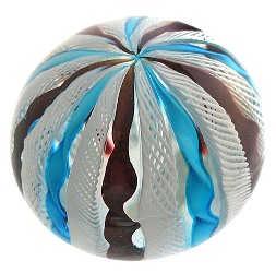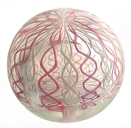 16 gedrehte Glasstäbe - weiß, rosa und helllila - punktförmig zusammengezogen; Hohl geblasen, somit spiegeln sich die Glasstäbe zusätzlich an der Innenwand. Gefertigt in den 80er/90er Jahren, original Murano, D: ca. 7,3 cm