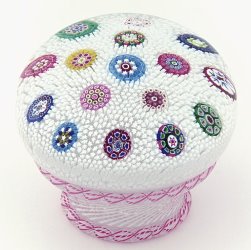 Carpet Ground - weißer Sternchen-Millefiori-Grund mit bunten Millefiori-Canes. Dieser Paperweight ist verschmolzen mit einem weißen Latticinio-Körbchen, welches am oberen und unteren Rand mit einer weiß-rosa Torsade verziert ist. 1992, lim. Edition 150, nummeriert, signiert und datiert, D: ca. 8,5 cm, H: ca. 8 cm