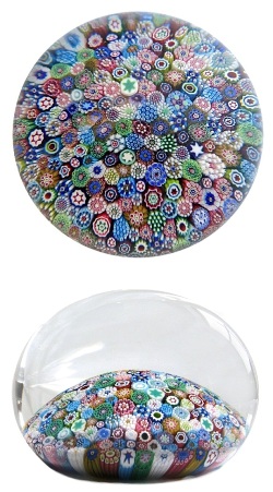 Ein Klassiker unter den Millefiori-Paperweights: Buntes Close-Millefiori - die äußeren Millefiori-Stäbchen sind punktförmig auf der Unterseite bis zum Zentrum zusammengezogen, lim. Edition 250, nummeriert und Saint-Louis-Signatur-Cane ’SL 1993’, D: ca 8 cm