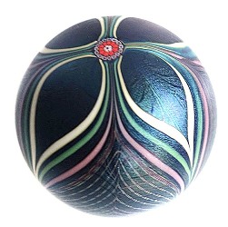 Dunkelblauer, irisierender Paperweight in feiner Kammzugtechnik mit geometrischem Motiv dekoriert; 1982, am Boden signiert, D: ca. 7,8 cm