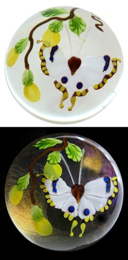 Großer weißer Schmetterling mit Blütenranke über klarem, irisierendem Grund, der je nach Unterlage und Lichteinfall mehr oder weniger sichtbar ist; compound, signiert und datiert, D: ca. 9,3 cm