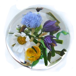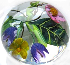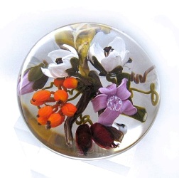 Zitat Stefan Bracht: Die dunkelvioletten kleinen Astern dominieren zusammen mit der kleinen Dahlie das herbstliche Bild. Die Beeren bereichern Farben und Formen, ohne exakte Vorbilder der Natur. Ein schon verfärbtes und hinfälliges Blatt ergänzt die Szene, in der eine kleine weiße Blüte ihre Staubfäden zur nicht mehr ganz warmen Sonne streckt. Die Stiele und Hölzchen sind besonders liebevoll gestaltet. Die Gestalt des Paperweights macht die Einschlüsse sehr plastisch und zum Greifen nah. Unikat, Signatur-Cane ’SB’ und zusätzlich gravierte Signatur, D: ca. 7,3 cm