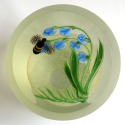 Hummel und blaue Blumen über einem hellen, irisierenden Polster; schräg angeschliffenes Fenster. Die Oberfläche des Paperweights ist mattiert. Ein original Chris Buzzini Paperweight von 1985, limited Ed. 200, nummeriert, signiert und datiert, D: ca. 7 cm