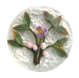 Stilisierter Zweig mit Blüte und Knospen auf weißem Kröselgrund. 2012, JH-Signatur-Cane, Miniatur-Paperweight, D: ca. 5,7 cm