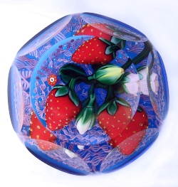 Erdbeeren zum Anbeißen - weiße Blüten und drei reife rote Früchte auf rosa Latticinio, transparenter blauer Grund; Topschliff und sechs seitliche Fenster, Unikat, Signatur-Cane ’JK’ D: ca. 8,9 cm