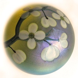Gold-irisierender Paperweight mit weißen Dogwoodblüten - im Gegenlicht "leuchtet" der Paperweight golden; am Boden gravierte Signatur: O & F 1982, D: ca. 8,5 cm