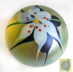 Gold-irisierender Paperweight mit weißer Spinnenlilie über dunklen Blättern - im Gegenlicht "leuchtet" der Paperweight golden; seitliches Signatur-Cane ’OF 84’ und zusätzlich am Boden gravierte Signatur: L. Hudin, Orient & Flume, May 1985, D: ca. 7,7 cm