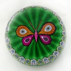 Großer Schmetterling auf einem grünen Kissen, umrandet von einer blau-weiß-grünen Millefiori-Girlande; Sonderausgabe 1975, "P 1975"-Signatur-Cane, limited. Ed. 450 (gefertigt wurden nur 372 Stück), D: ca. 7,5 cm