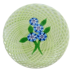 Drei Millefiori-Canes mit vier grünen Blättern unterlegt - sog. Posy oder Nosegay - auf einem hellgrün-rosa Latticinio-Polster; unübliche, aber gut auf das Design abgestimmte Paperweightform, Sonderausgabe 1977, signiert im Boden ’P-Cane’, lim. Edition 400 (gefertigt wurden nur 315 Stück), Miniatur-Paperweight, D: ca. 5,9 cm