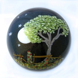 Am alten Gartenzaun ein knorriger Apfelbaum in einer sternenklaren Vollmondnacht; irisierend schwarzer Grund, compound, signiert und datiert, D: ca. 6,9 cm