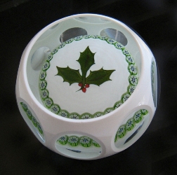 Grüner Stechpalmenzweig mit roten Beeren - umrandet von hellgrüner Millefiori-Girlande - auf weißem Kissen, umfangen von ebenfalls weißem Overlay; Topschliff und übereinander zwei Reihen mit jeweils acht Fenstern, 1978, ’P’-Signatur-Cane,lim. Edition 325 / gefertigt wurden 322 Stück, D: ca. 6,5 cm