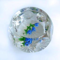 Kleine, blaue Glockenblume eingebettet in klares Glas; Top- und 6fach-Fensterschliff, Sternschliff am Boden, Sonderausgabe 1978, ’P’-Signatur-Cane, limited. Ed. 350, D: ca. 5,7 cm