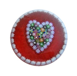Buntes Millefiori-Herz umgeben von einer hellblauen Millefiori-Girlande auf transparentrotem Grund, lim. Ed. 25 - ohne Topschliff - eine Sonderausgabe für farfalla; ’P’-Signatur-Cane, Miniatur-Paperweight, D: ca. 6,3 cm