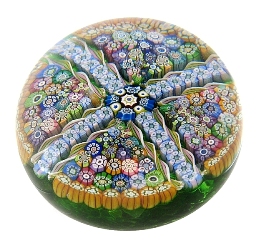 Bunte, komplexe Millefiori-Canes - Schmetterlings-Silhouette im Zentrum - auf kobaltblauem Grund; lim. Edition speziell für farfalla-Paperweights gefertigt; am Boden graviert: 43/99 farfalla 1985, D: ca. 6,5 cm